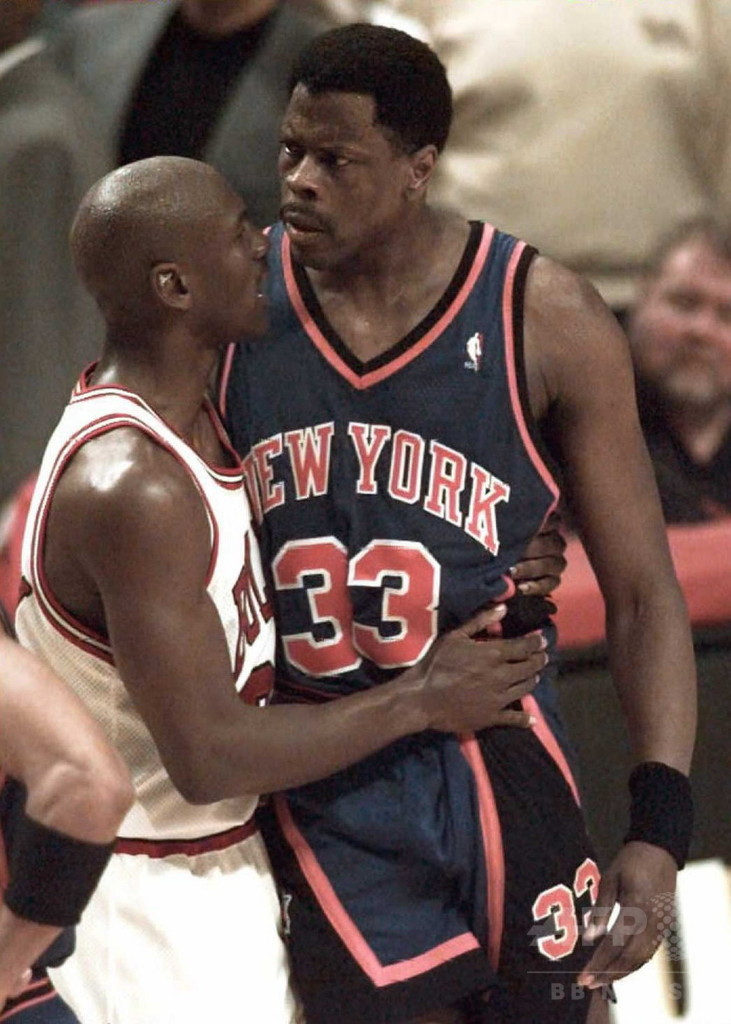 Chicago Bulls guard Michael Jordan(L) tries to calm down New York Knicks center Patrick Ewing after Ewing was called for a technical foul 07 May during the fourth quarter of game two of the Eastern Conference semifinals at the United Center in Chicago. (c)AFP/Vincent LAFORET