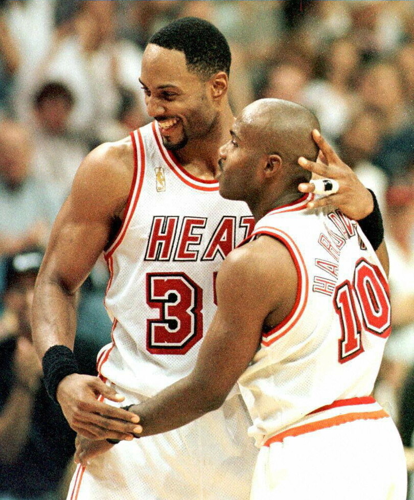 Miami Heat center Alonzo Mourning (L) and Tim Hardaway (R) celebrate as the New York Knicks called a time out with less than two seconds left after a basket by Heat forward Jamal Mashburn put them ahead in their second-round divisional playoff game 88-84. (c)AFP/RHONA WISE