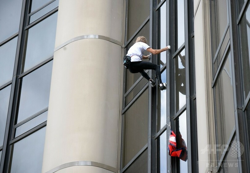 【4月29日 AFP】世界各地の高層ビルをよじ登り「スパイダーマン(Spiderman)」の異名を持つフランス人フリークライマーのアラン・ロベール(Alain Robert)さんが28日、パリ(Paris)にある高さ210メートルのモンパルナス・タワー(Montparnasse Tower)に現れた。ネパールで起きた地震の犠牲者に捧げる行動とみられ、手にはネパールの国旗が握られていた。(c)AFP