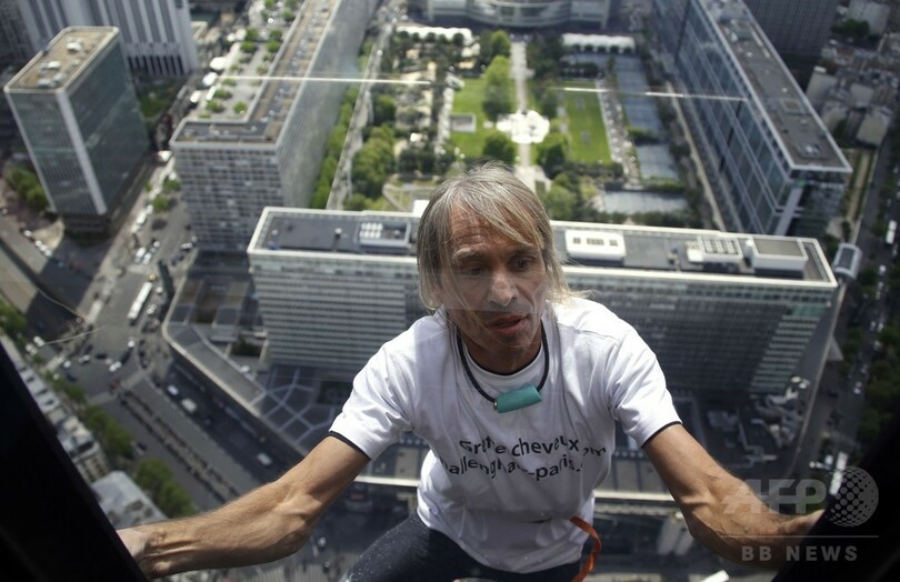 【4月29日 AFP】世界各地の高層ビルをよじ登り「スパイダーマン(Spiderman)」の異名を持つフランス人フリークライマーのアラン・ロベール(Alain Robert)さんが28日、パリ(Paris)にある高さ210メートルのモンパルナス・タワー(Montparnasse Tower)に現れた。ネパールで起きた地震の犠牲者に捧げる行動とみられ、手にはネパールの国旗が握られていた。(c)AFP