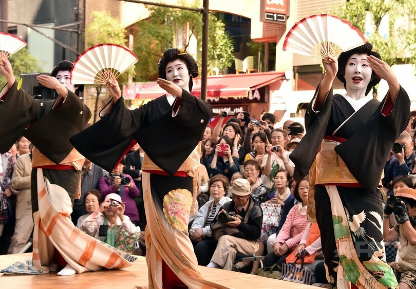 【5月6日 AFP】こどもの日の5日、東京・銀座で「銀座柳(Ginza Yanagi)まつり」が開かれ、扇子を手に芸者たちが踊る姿が見られた。また、舞踏集団「大駱駝艦(Dairakudakan)」も参加し、前衛舞踏を披露。行楽客らの目を楽しませた。(c)AFP