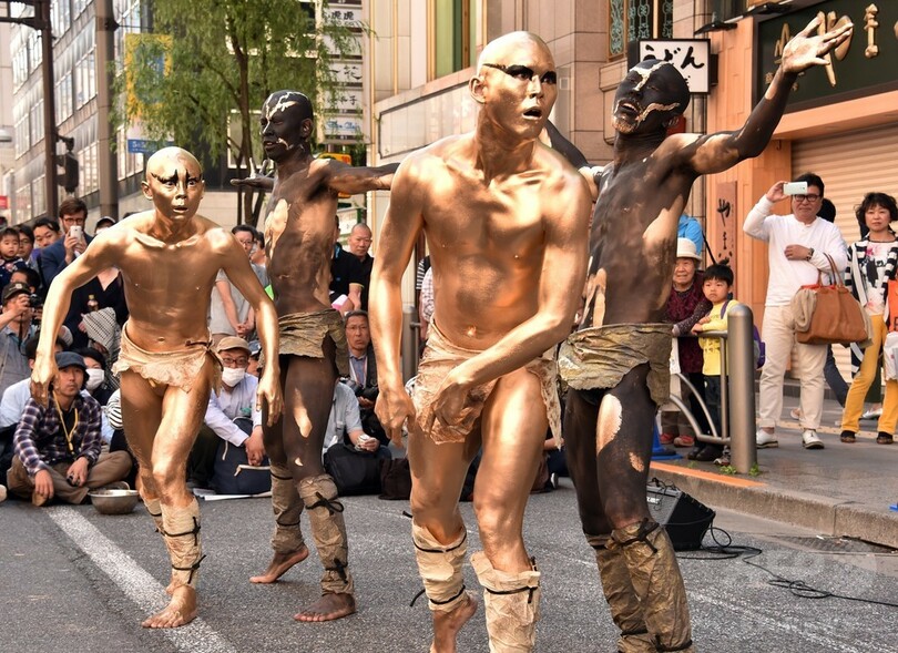 【5月6日 AFP】こどもの日の5日、東京・銀座で「銀座柳(Ginza Yanagi)まつり」が開かれ、扇子を手に芸者たちが踊る姿が見られた。また、舞踏集団「大駱駝艦(Dairakudakan)」も参加し、前衛舞踏を披露。行楽客らの目を楽しませた。(c)AFP