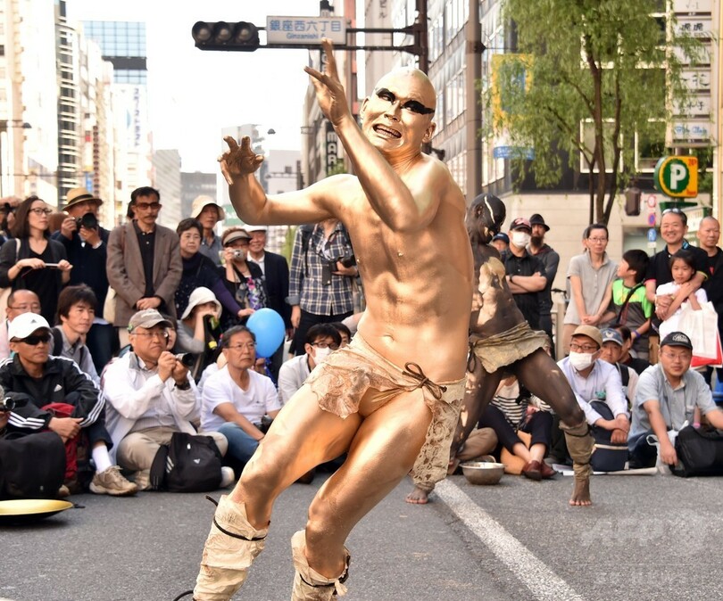【5月6日 AFP】こどもの日の5日、東京・銀座で「銀座柳(Ginza Yanagi)まつり」が開かれ、扇子を手に芸者たちが踊る姿が見られた。また、舞踏集団「大駱駝艦(Dairakudakan)」も参加し、前衛舞踏を披露。行楽客らの目を楽しませた。(c)AFP