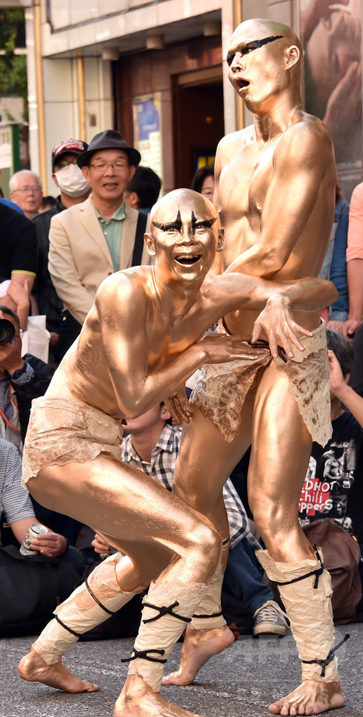 【5月6日 AFP】こどもの日の5日、東京・銀座で「銀座柳(Ginza Yanagi)まつり」が開かれ、扇子を手に芸者たちが踊る姿が見られた。また、舞踏集団「大駱駝艦(Dairakudakan)」も参加し、前衛舞踏を披露。行楽客らの目を楽しませた。(c)AFP