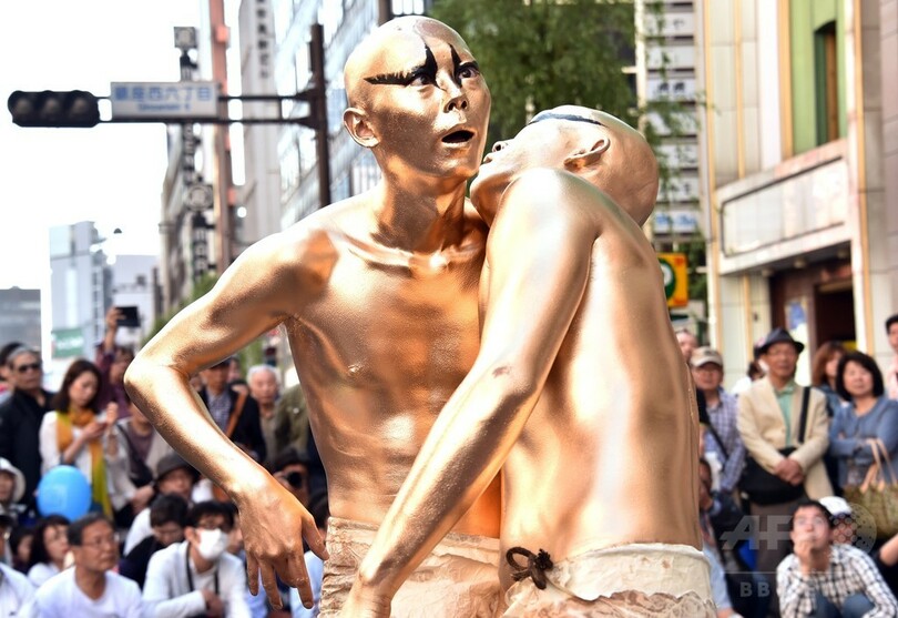 【5月6日 AFP】こどもの日の5日、東京・銀座で「銀座柳(Ginza Yanagi)まつり」が開かれ、扇子を手に芸者たちが踊る姿が見られた。また、舞踏集団「大駱駝艦(Dairakudakan)」も参加し、前衛舞踏を披露。行楽客らの目を楽しませた。(c)AFP
