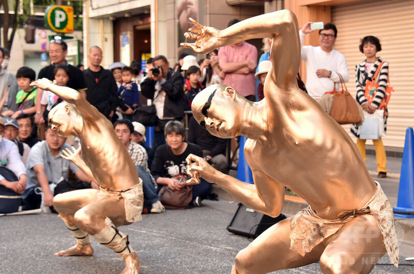 【5月6日 AFP】こどもの日の5日、東京・銀座で「銀座柳(Ginza Yanagi)まつり」が開かれ、扇子を手に芸者たちが踊る姿が見られた。また、舞踏集団「大駱駝艦(Dairakudakan)」も参加し、前衛舞踏を披露。行楽客らの目を楽しませた。(c)AFP