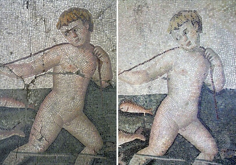 【5月7日 AFP】古代ローマ時代の貴重なモザイク画少なくとも10点が、おざなりな修復作業と移設の過程で著しく損傷したとの報告を受けて、トルコ当局は5日、これらのモザイク画を保管する南部ハタイ(Hatay)の考古学博物館に対する捜査に乗り出した。掲載の写真は、左が修復前、右が修復後。(c)AFP