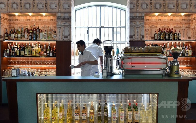 エントランスには、ヴェルサイユ国立高等建築学校(Ecole Nationale Superieure d'Architecture et de Versailles)の学生がデザインしたキッズスペースと、映画監督のウェス・アンダーソン(Wes Anderson)氏がミラノの伝統的なカフェの雰囲気を再現したバーを設置した。(c)AFP
