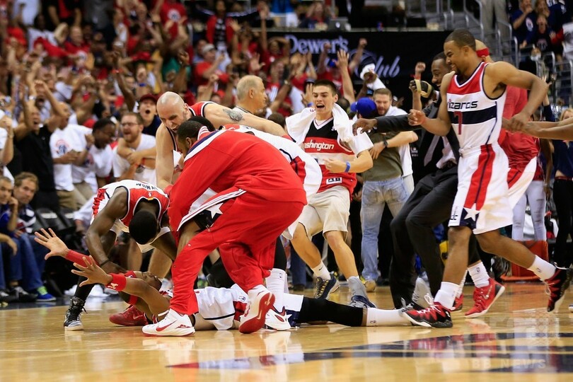 そしてホークスのマイク・マスカラ(Mike Muscala)の3ポイントシュートが決まり、ウィザーズは残り14.8秒で同点に追いつかれたものの、ボールを保持していたピアースのジャンプシュートが試合終了のブザーと同時に決まり、選手たちは喜びを爆発させた。