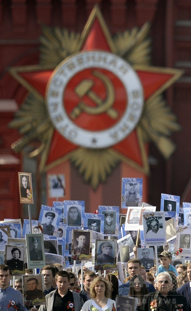 【5月10日 AFP】モスクワ(Moscow)市内で9日、旧ソ連の対ナチス・ドイツ(Nazis)戦勝70年を記念する軍事パレードの後、「不死身の連隊(Immortal Regiment)」と銘打たれた市民の祝賀行進が行われ、ウラジーミル・プーチン(Vladimir Putin)政権下で行われた行進としては過去最大となる50万人規模の参加者を集めた。