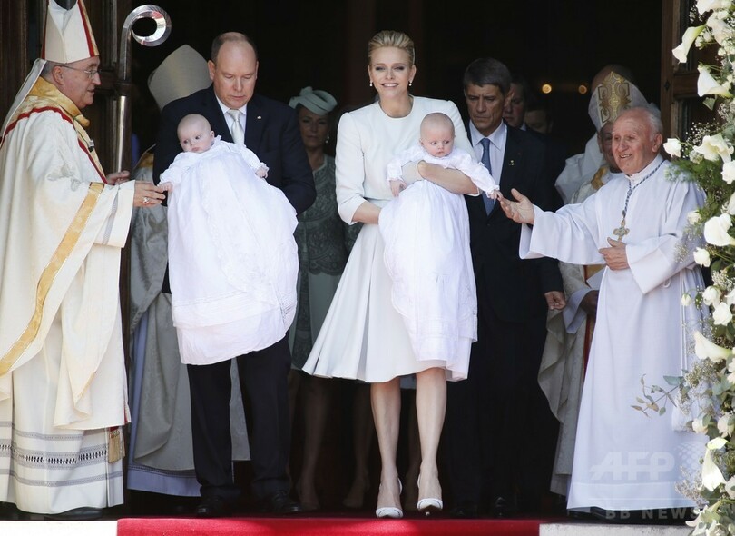 【5月11日 AFP】モナコ公国の元首アルベール2世公(Prince Albert II)とシャルレーヌ公妃(Princess Charlene)夫妻の双子の赤ちゃん、ジャック(Jacques)公子とガブリエラ(Gabriella)公女の洗礼式が10日、モンテカルロ(Monte Carlo)の大聖堂で執り行われた。(c)AFP