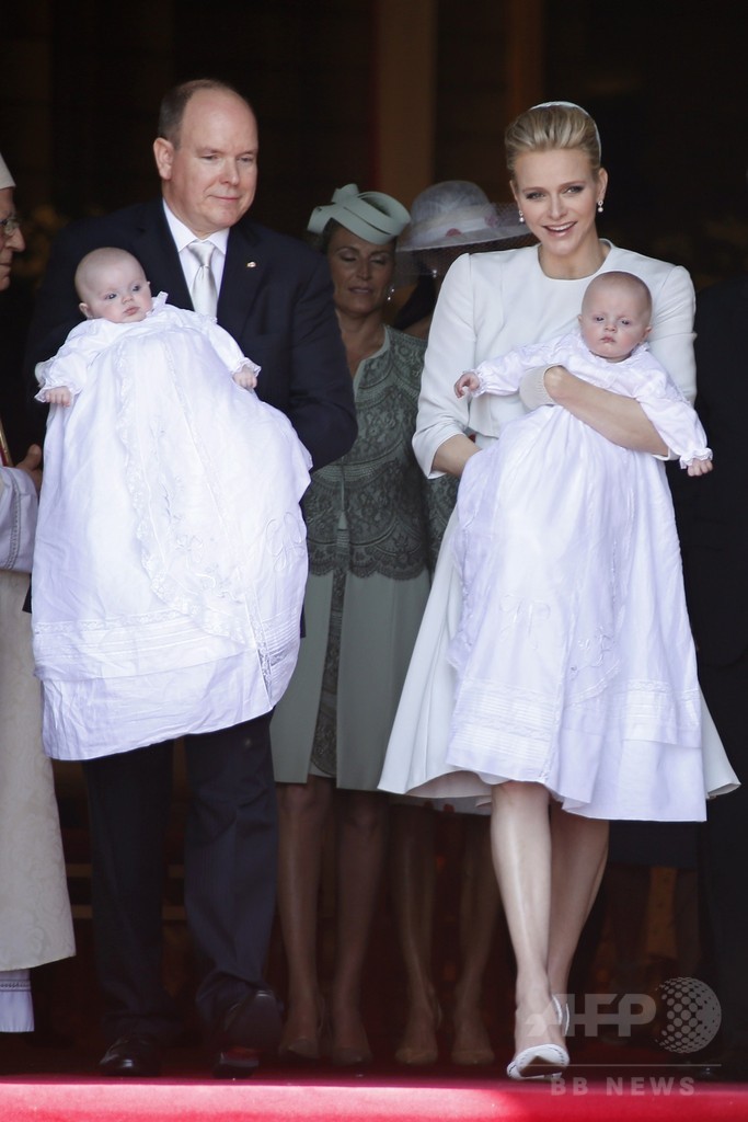【5月11日 AFP】モナコ公国の元首アルベール2世公(Prince Albert II)とシャルレーヌ公妃(Princess Charlene)夫妻の双子の赤ちゃん、ジャック(Jacques)公子とガブリエラ(Gabriella)公女の洗礼式が10日、モンテカルロ(Monte Carlo)の大聖堂で執り行われた。(c)AFP