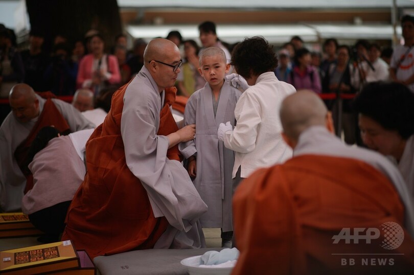 【5月12日 AFP】韓国ソウル(Seoul)の曹渓(そうけい)宗の寺で11日、「僧侶になる子どもたち」と題された儀式が行われ、集まった子どもたちの頭髪が、僧侶らによってそり落された。子どもたちは、仏陀の誕生日とされる25日(旧暦4月8日)までの2週間この寺に滞在し、仏教について学ぶ。(c)AFP