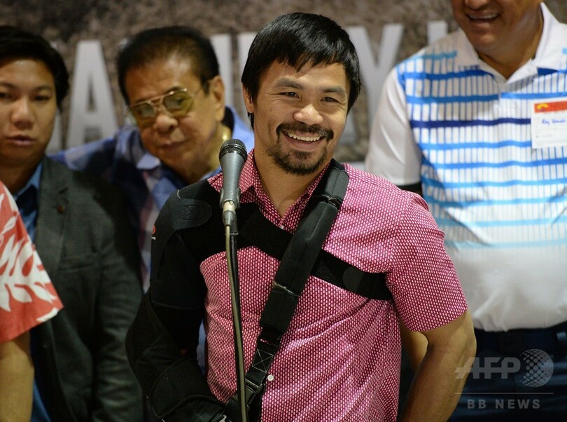 パッキャオがフィリピンに帰国、手術した右肩はつり包帯で固定