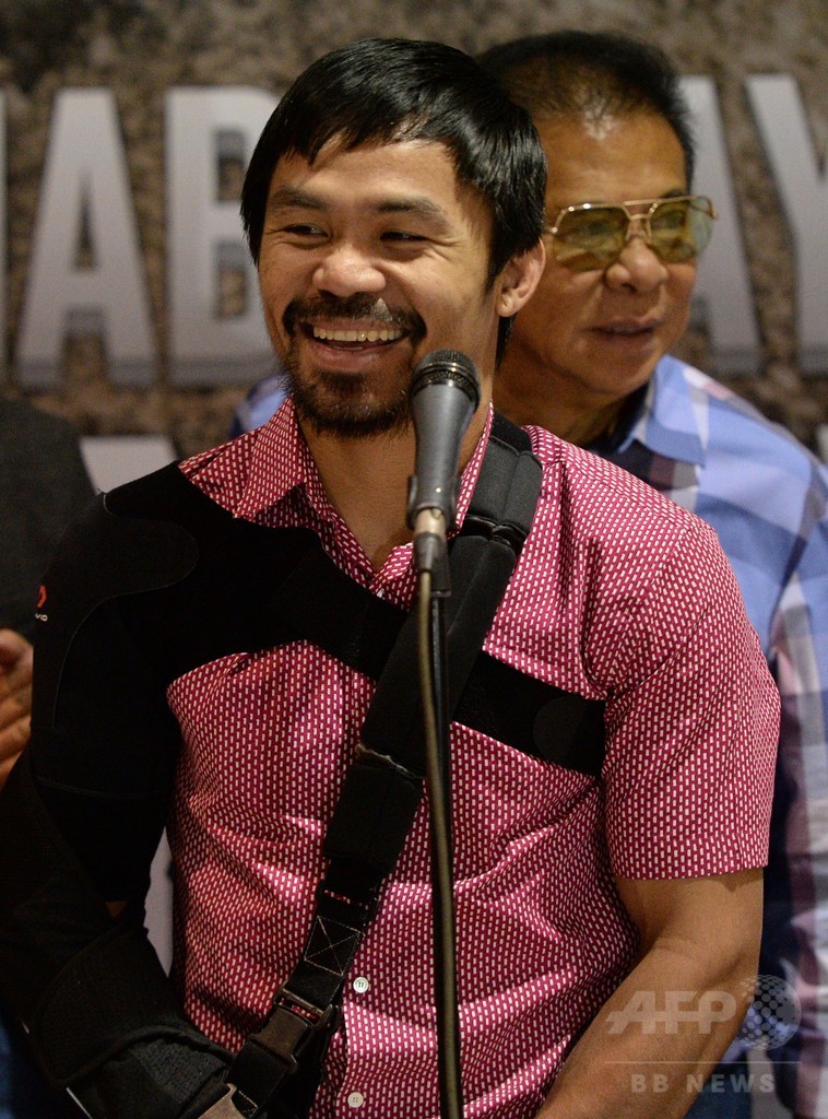 パッキャオがフィリピンに帰国、手術した右肩はつり包帯で固定