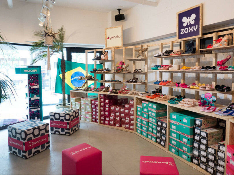ブランド発祥の地であるイパネマビーチの旗艦店をイメージした2フロア構成のコンセプトショップでは、「イパネマ」の全コレクションを幅広いサイズ展開でラインナップ。2階では「グレンデーネ」社のシューズブランド「ザクシー(ZAXY)」「グレンダ(grendha)」「メル(mel)」など、本国で人気のシューズも販売する。