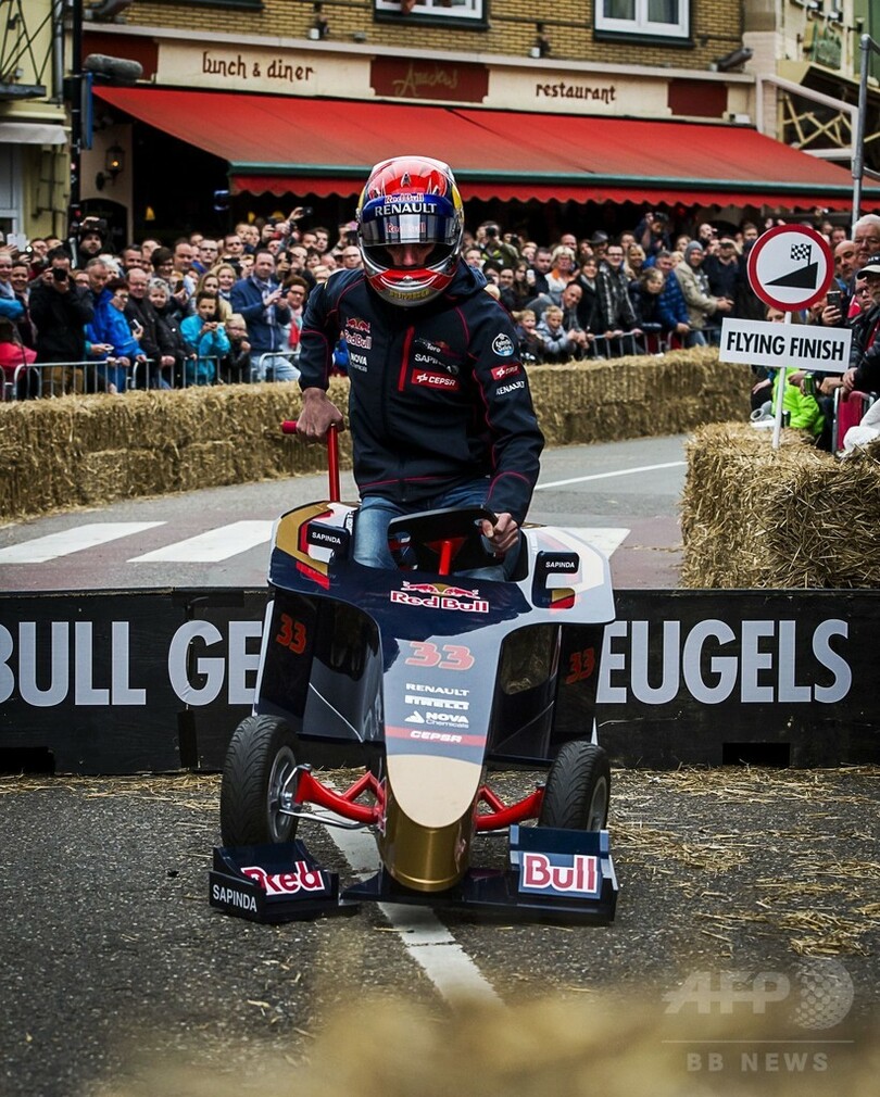 【5月17日 AFP】オランダ・ファルケンブルグ(Valkenburg)で16日、動力をもたない手作りの車で坂道を下る「レッドブル・ソープボックス・レース(Red Bull Soapbox Race)」が開催され、地元オランダ出身のF1ドライバー、マックス・フェルスタッペン(Max Verstappen)選手が所属チーム、トロ・ロッソ(Toro Rosso)のF1マシンそっくりにカラーリングを施された車で出走。麦わらを左右に積んで作られた全長350メートル、斜度12度のコースに挑戦した。(c)AFP
