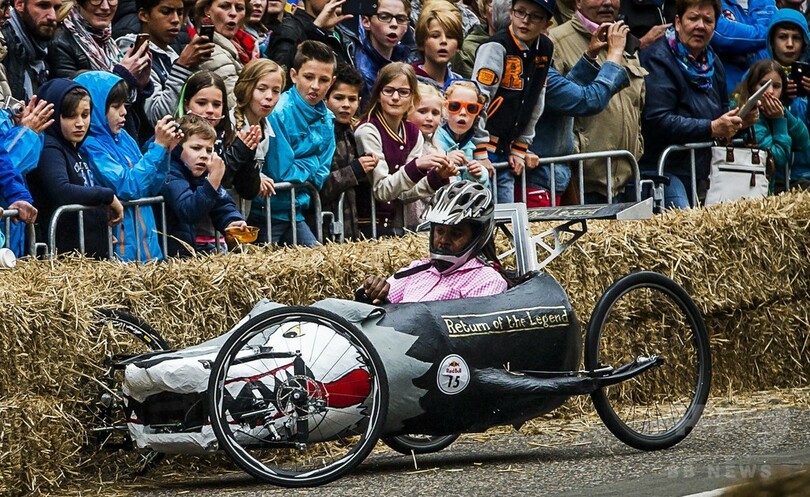 【5月17日 AFP】オランダ・ファルケンブルグ(Valkenburg)で16日、動力をもたない手作りの車で坂道を下る「レッドブル・ソープボックス・レース(Red Bull Soapbox Race)」が開催され、地元オランダ出身のF1ドライバー、マックス・フェルスタッペン(Max Verstappen)選手が所属チーム、トロ・ロッソ(Toro Rosso)のF1マシンそっくりにカラーリングを施された車で出走。麦わらを左右に積んで作られた全長350メートル、斜度12度のコースに挑戦した。(c)AFP