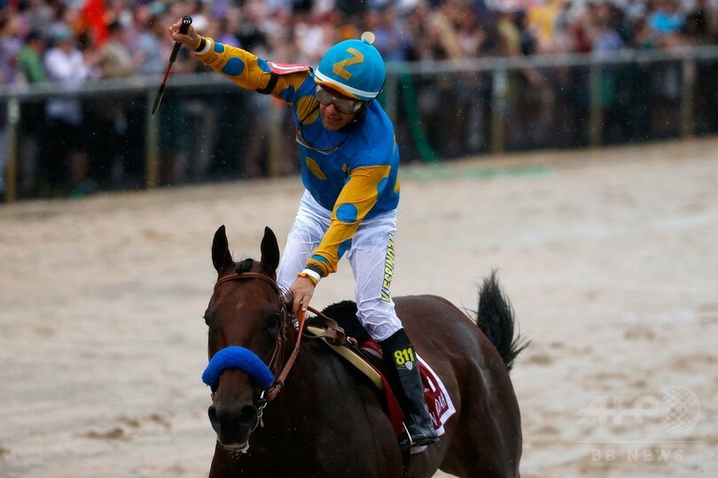 アファームド以降では、アメリカンファラオは三冠のうちの最初の2レースを制した14頭目の馬となっている。(c)AFP