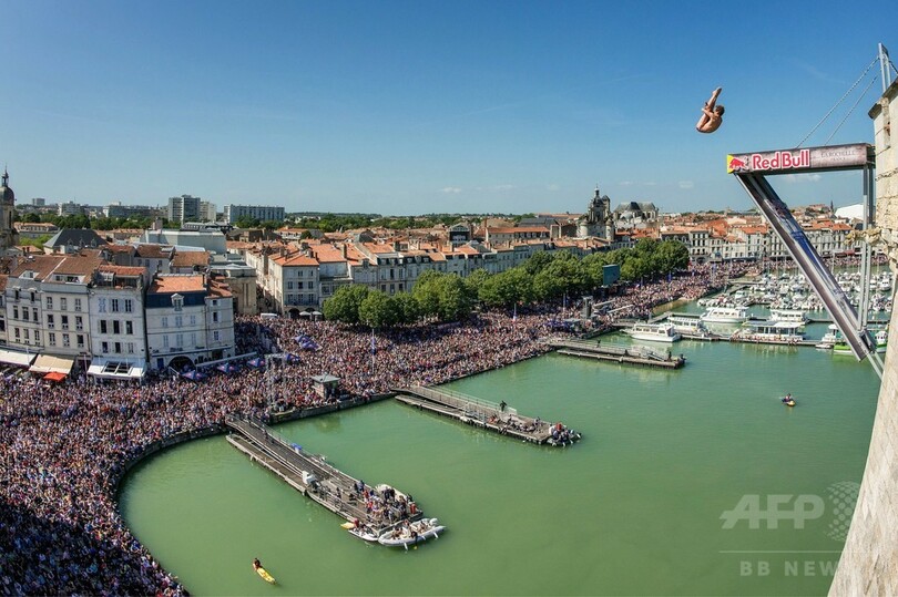 【5月18日 AFP】フランスのラ・ロシェル(La Rochell)で17日、レッドブル(Red Bull)主催のクリフダイビングの世界大会「レッドブル・クリフ・ダイビング・ワールド・シリーズ(Red Bull Cliff Diving World Series)」の今季第2戦が行われ、世界中から集まった一流選手たちがサン・ニコラ塔(Saint Nicolas Tower)の約27メートル地点に設置された台から華麗な飛び込みを披露した。(c)AFP