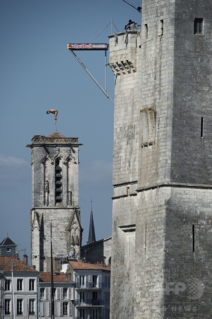 【5月18日 AFP】フランスのラ・ロシェル(La Rochell)で17日、レッドブル(Red Bull)主催のクリフダイビングの世界大会「レッドブル・クリフ・ダイビング・ワールド・シリーズ(Red Bull Cliff Diving World Series)」の今季第2戦が行われ、世界中から集まった一流選手たちがサン・ニコラ塔(Saint Nicolas Tower)の約27メートル地点に設置された台から華麗な飛び込みを披露した。(c)AFP