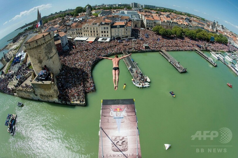 【5月18日 AFP】フランスのラ・ロシェル(La Rochell)で17日、レッドブル(Red Bull)主催のクリフダイビングの世界大会「レッドブル・クリフ・ダイビング・ワールド・シリーズ(Red Bull Cliff Diving World Series)」の今季第2戦が行われ、世界中から集まった一流選手たちがサン・ニコラ塔(Saint Nicolas Tower)の約27メートル地点に設置された台から華麗な飛び込みを披露した。(c)AFP
