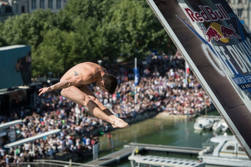 【5月18日 AFP】フランスのラ・ロシェル(La Rochell)で17日、レッドブル(Red Bull)主催のクリフダイビングの世界大会「レッドブル・クリフ・ダイビング・ワールド・シリーズ(Red Bull Cliff Diving World Series)」の今季第2戦が行われ、世界中から集まった一流選手たちがサン・ニコラ塔(Saint Nicolas Tower)の約27メートル地点に設置された台から華麗な飛び込みを披露した。(c)AFP