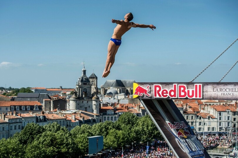 【5月18日 AFP】フランスのラ・ロシェル(La Rochell)で17日、レッドブル(Red Bull)主催のクリフダイビングの世界大会「レッドブル・クリフ・ダイビング・ワールド・シリーズ(Red Bull Cliff Diving World Series)」の今季第2戦が行われ、世界中から集まった一流選手たちがサン・ニコラ塔(Saint Nicolas Tower)の約27メートル地点に設置された台から華麗な飛び込みを披露した。(c)AFP