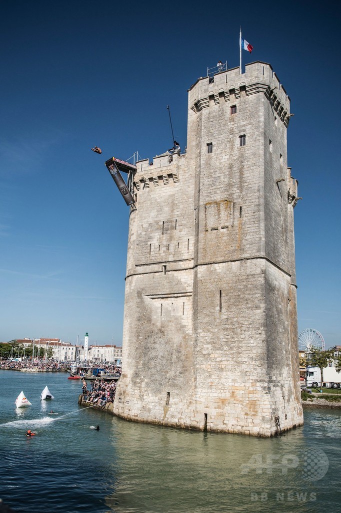 【5月18日 AFP】フランスのラ・ロシェル(La Rochell)で17日、レッドブル(Red Bull)主催のクリフダイビングの世界大会「レッドブル・クリフ・ダイビング・ワールド・シリーズ(Red Bull Cliff Diving World Series)」の今季第2戦が行われ、世界中から集まった一流選手たちがサン・ニコラ塔(Saint Nicolas Tower)の約27メートル地点に設置された台から華麗な飛び込みを披露した。(c)AFP