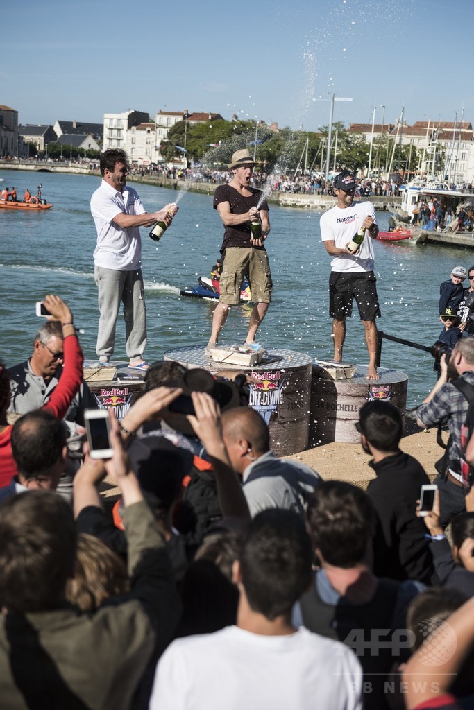 【5月18日 AFP】フランスのラ・ロシェル(La Rochell)で17日、レッドブル(Red Bull)主催のクリフダイビングの世界大会「レッドブル・クリフ・ダイビング・ワールド・シリーズ(Red Bull Cliff Diving World Series)」の今季第2戦が行われ、世界中から集まった一流選手たちがサン・ニコラ塔(Saint Nicolas Tower)の約27メートル地点に設置された台から華麗な飛び込みを披露した。(c)AFP
