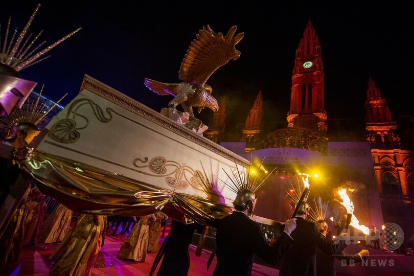 今年のライフ・ボールのテーマは、古代ローマの祭典「ヴェール・サクルム(Ver Sacrum、ラテン語で聖なる春の意)」。ネオゴシック建築の市庁舎が、楽園の鳥たちや天使、アマゾンの美女らに彩られた黄金の空想世界に変身した。
