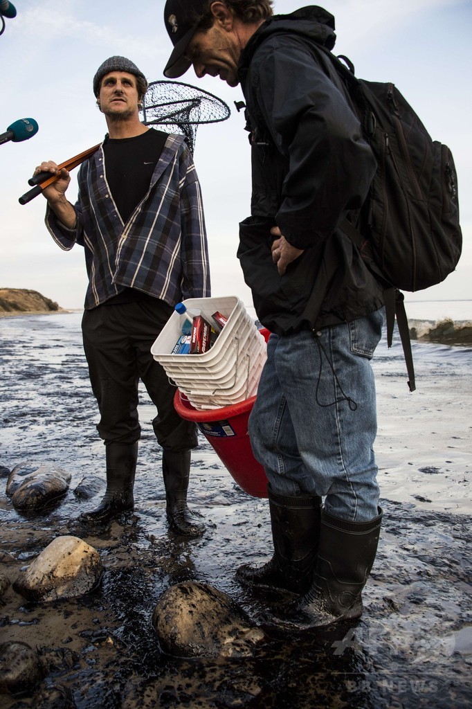石油流出は19日昼に始まり、長靴をはいたボランティアらが黒く染まった海岸の清掃作業に当たった。パイプラインを運営する米プレーンズ・オール・アメリカン・パイプライン(Plains All America Pipeline)社は、石油の海への流出をすでに食い止めたとしている。