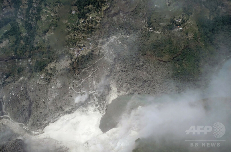 地滑りによる死傷者はいない。ネパール軍の兵士や専門家は土砂ダムの排水作業を行うため、ヘリコプターで現地に向かっている。(c)AFP