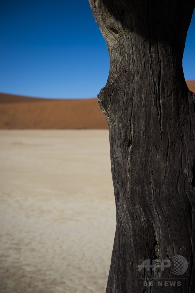 【5月26日 AFP】ナミビアのセスリム(Sesriem)に近いナミブ・ナウクルフト国立公園(Namib-Naukluft National Park)では、ソスフレイ(Sosusvlei)という砂漠と、立ち枯れた木が残る「デッド・フレイ(Deadvlei)」と呼ばれる場所が、不思議な魅力を放っている。(c)AFP