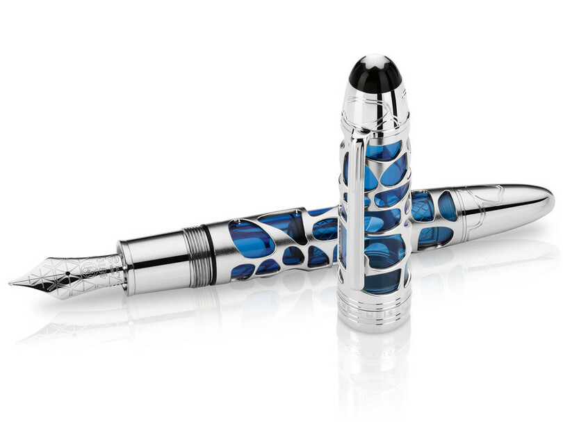 また「マイスターシュテュック ブルーアワー スケルトン149」は、よりアーティスティックなデザインの万年筆。キャップとボディのメタルマテリアルには切り取り加工とポリッシュ仕上げが施され、中からはブルーの透明なボディが覗く。
