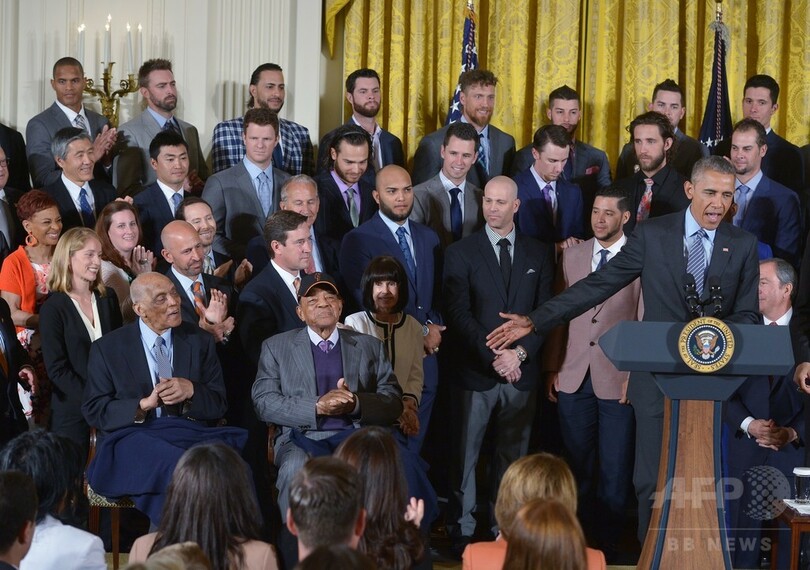 【6月5日 AFP】米大リーグ(MLB)、2014年のワールドシリーズを制覇したサンフランシスコ・ジャイアンツ(San Francisco Giants)の選手が4日、米ホワイトハウス(White House)を表敬訪問した。(c)AFP