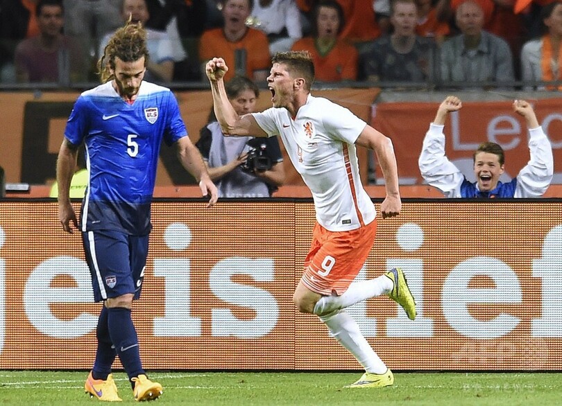 オランダのクラース・ヤン・フンテラール(Klaas-Jan Huntelaar)の2得点などで一時は1-3の劣勢に立たされた米国だったが、後半43分にダニー・ウィリアムズ(Danny Williams)が同点弾を決めると、直後にボビー・ウッド(Bobby Wood)が逆転ゴールを決めた。(c)AFP