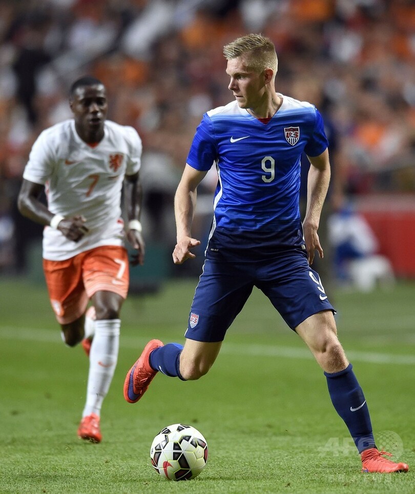 オランダのクラース・ヤン・フンテラール(Klaas-Jan Huntelaar)の2得点などで一時は1-3の劣勢に立たされた米国だったが、後半43分にダニー・ウィリアムズ(Danny Williams)が同点弾を決めると、直後にボビー・ウッド(Bobby Wood)が逆転ゴールを決めた。(c)AFP