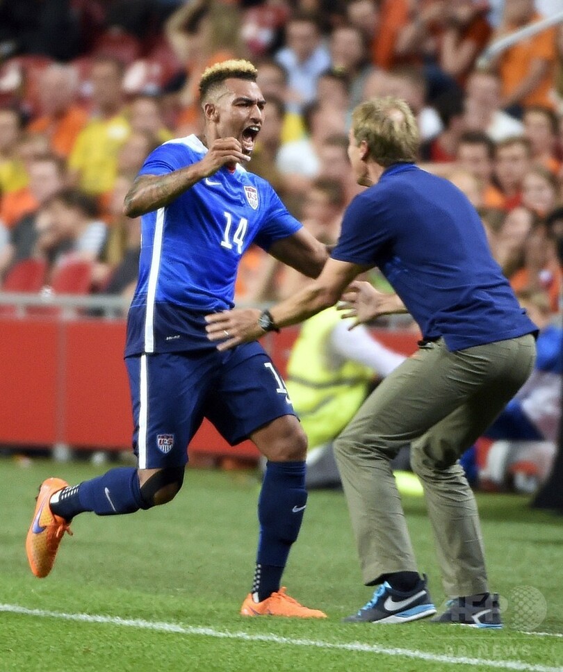 オランダのクラース・ヤン・フンテラール(Klaas-Jan Huntelaar)の2得点などで一時は1-3の劣勢に立たされた米国だったが、後半43分にダニー・ウィリアムズ(Danny Williams)が同点弾を決めると、直後にボビー・ウッド(Bobby Wood)が逆転ゴールを決めた。(c)AFP