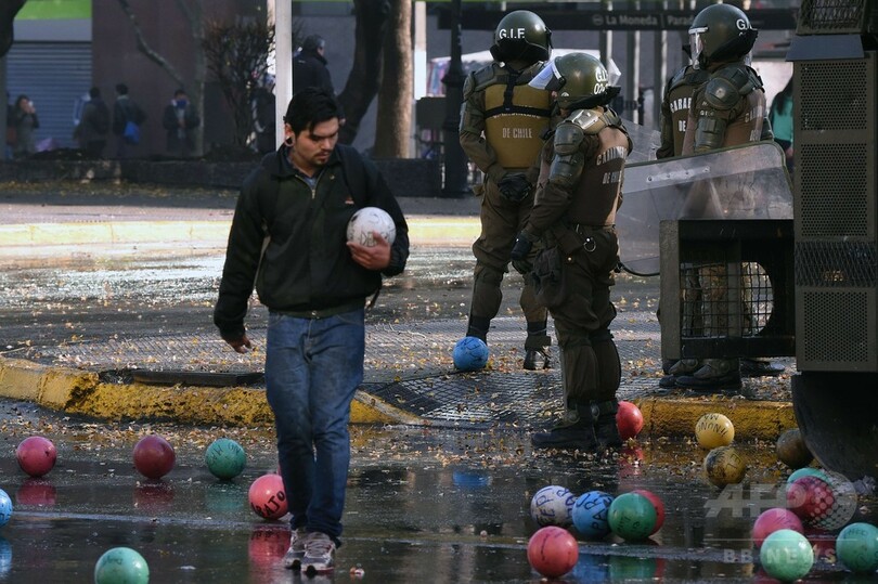 【6月12日 AFP】チリの首都サンティアゴ(Santiago)で11日、不十分な教育改革に反対するデモに参加した学生数千人がコパ・アメリカ(2015 Copa America)開催の数時間前、数百の色とりどりのサッカーボールなどを警官隊に向かって蹴るなどした。