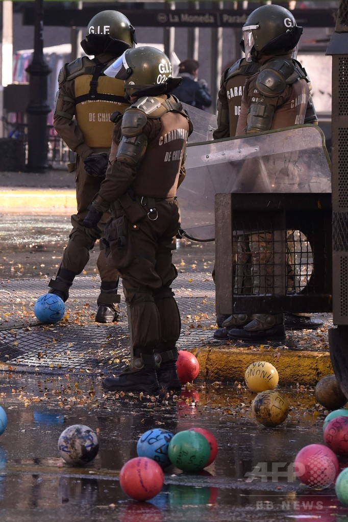 【6月12日 AFP】チリの首都サンティアゴ(Santiago)で11日、不十分な教育改革に反対するデモに参加した学生数千人がコパ・アメリカ(2015 Copa America)開催の数時間前、数百の色とりどりのサッカーボールなどを警官隊に向かって蹴るなどした。