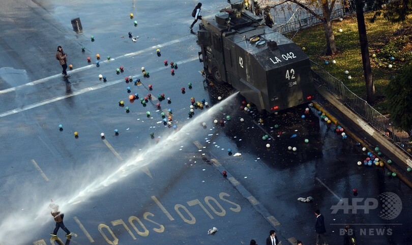 濃い緑色の制服に防弾ベスト姿の機動隊は、全ての者に無償で質の高い教育を求める走り書きのメッセージが書かれたボールの波をかきわけて進んだ。