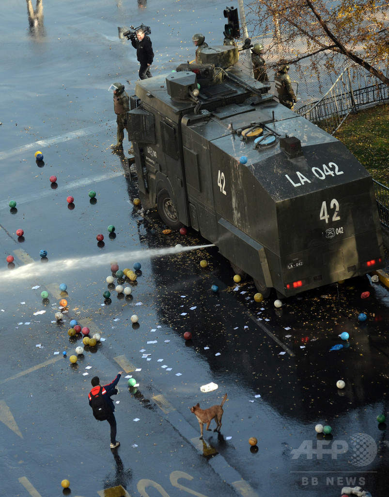 【6月12日 AFP】チリの首都サンティアゴ(Santiago)で11日、不十分な教育改革に反対するデモに参加した学生数千人がコパ・アメリカ(2015 Copa America)開催の数時間前、数百の色とりどりのサッカーボールなどを警官隊に向かって蹴るなどした。