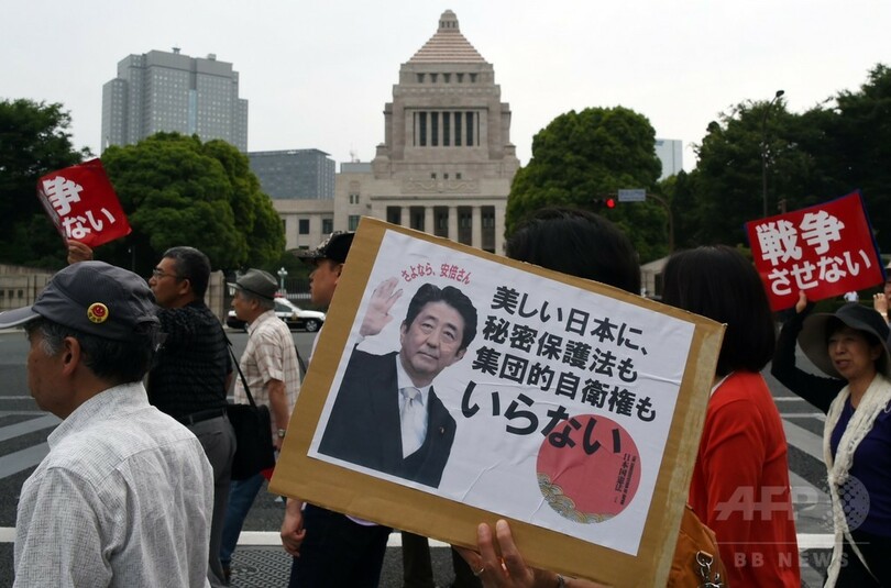 【6月15日 AFP】国会で審議が続いている安全保障関連法案に反対するデモや集会が14日、都内各所で行われた。国会議事堂周辺で行われたデモでは、「戦争させない」、「9条壊すな」などと書かれたプラカードを掲げ、約2万5000人の参加者らが抗議した。(c)AFP