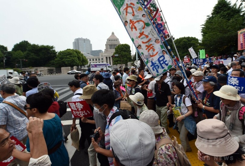 【6月15日 AFP】国会で審議が続いている安全保障関連法案に反対するデモや集会が14日、都内各所で行われた。国会議事堂周辺で行われたデモでは、「戦争させない」、「9条壊すな」などと書かれたプラカードを掲げ、約2万5000人の参加者らが抗議した。(c)AFP