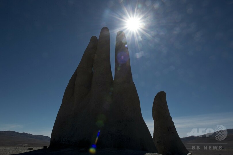 【6月15日 AFP】チリ・アントファガスタ(Antofagasta)郊外にそびえる高さ11メートルのモニュメント「La Mano del Desierto(砂漠の手)」。同国の彫刻家マリオ・イララザバル(Mario Irrazabal)氏が1992年に制作した。(c)AFP