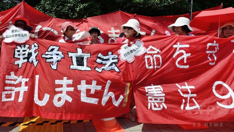 【6月21日 AFP】都内の国会周辺で20日、安倍晋三(Shinzo Abe)首相が成立を目指している安全保障関連法案に抗議するデモが行われた。女性を中心とした何千人もの参加者らは赤い服を着て人間の鎖を作り、国会議事堂を取り囲んだ。(c)AFP