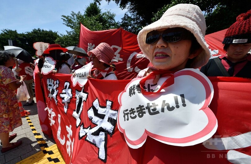 【6月21日 AFP】都内の国会周辺で20日、安倍晋三(Shinzo Abe)首相が成立を目指している安全保障関連法案に抗議するデモが行われた。女性を中心とした何千人もの参加者らは赤い服を着て人間の鎖を作り、国会議事堂を取り囲んだ。(c)AFP
