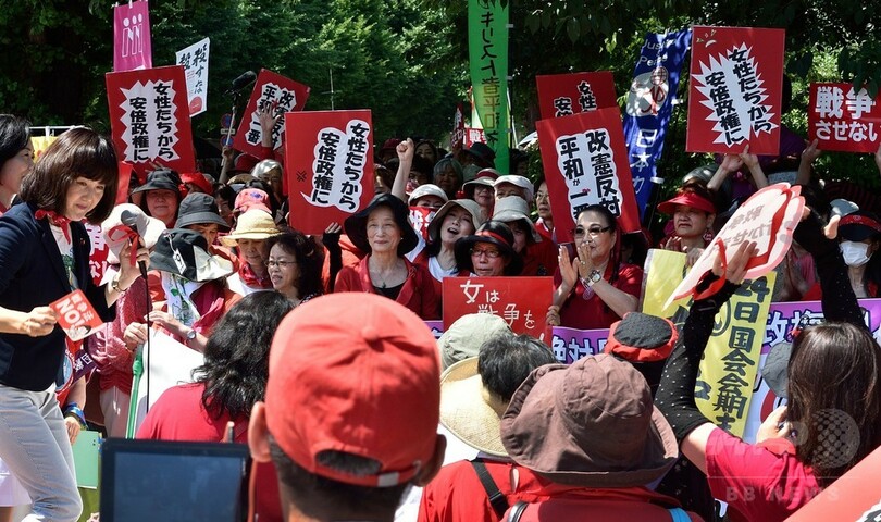 【6月21日 AFP】都内の国会周辺で20日、安倍晋三(Shinzo Abe)首相が成立を目指している安全保障関連法案に抗議するデモが行われた。女性を中心とした何千人もの参加者らは赤い服を着て人間の鎖を作り、国会議事堂を取り囲んだ。(c)AFP