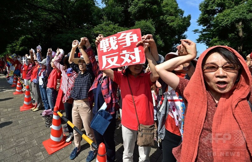 【6月21日 AFP】都内の国会周辺で20日、安倍晋三(Shinzo Abe)首相が成立を目指している安全保障関連法案に抗議するデモが行われた。女性を中心とした何千人もの参加者らは赤い服を着て人間の鎖を作り、国会議事堂を取り囲んだ。(c)AFP